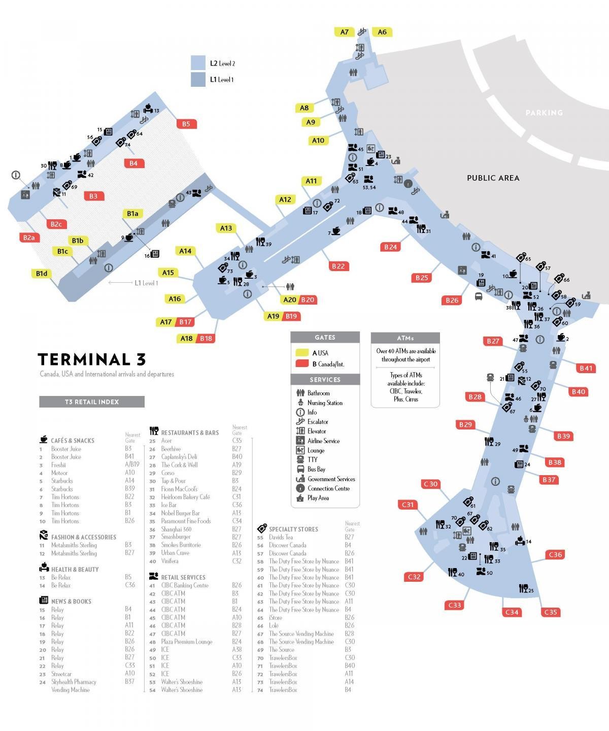 Terminal 3 serves WestJet, Air Transat, Sunwing, and a wide range of international and charter airlines, including OneWorld and SkyTeam partners. Terminal layout: